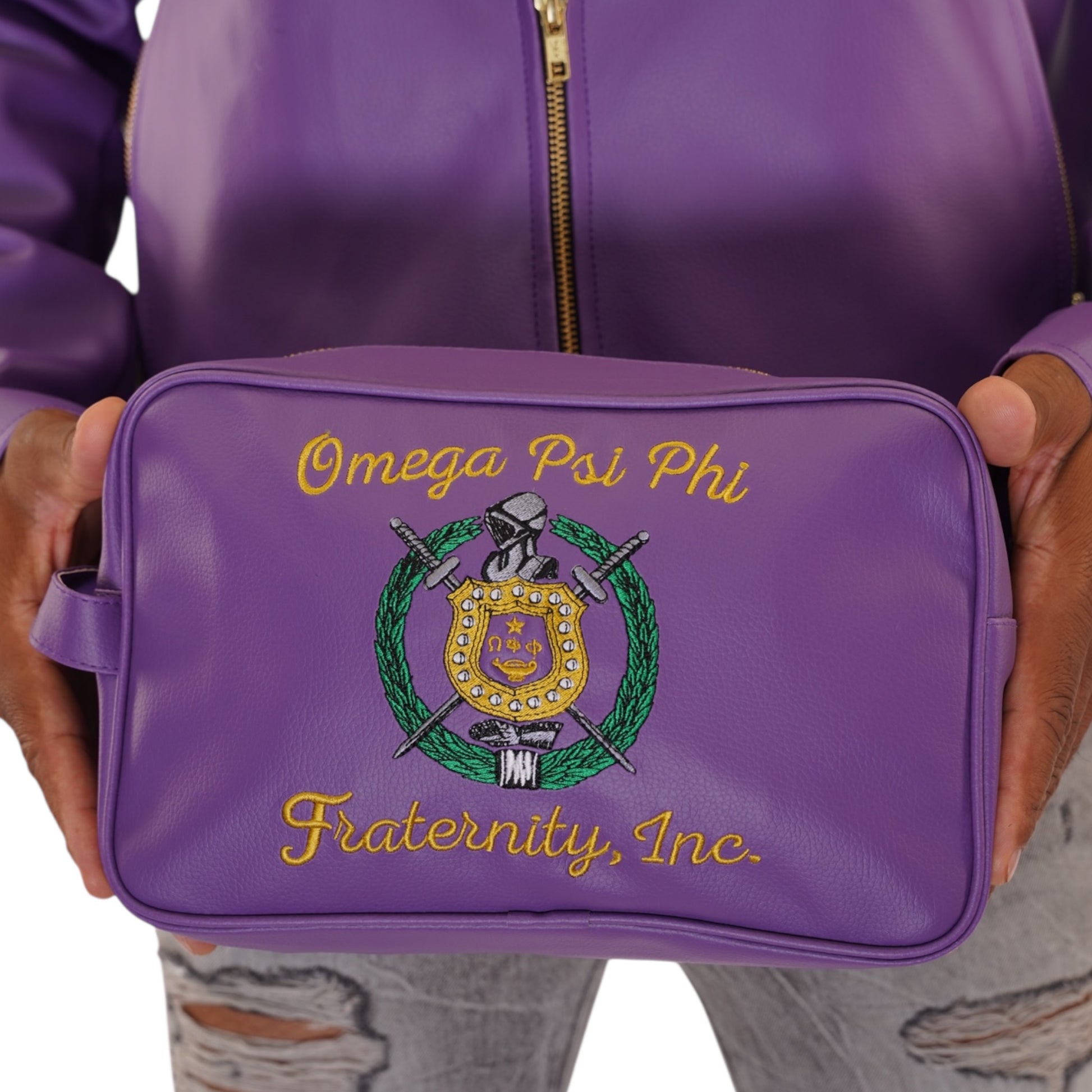 Elevate your travel essentials with the Omega Psi Phi Toiletry Bag, crafted from premium leather and accented with striking gold zippers. Its compact, travel-friendly size keeps your toiletries organized and accessible, while the elegant embroidery adds a distinguished touch. Perfect for those who value style and functionality on the go.